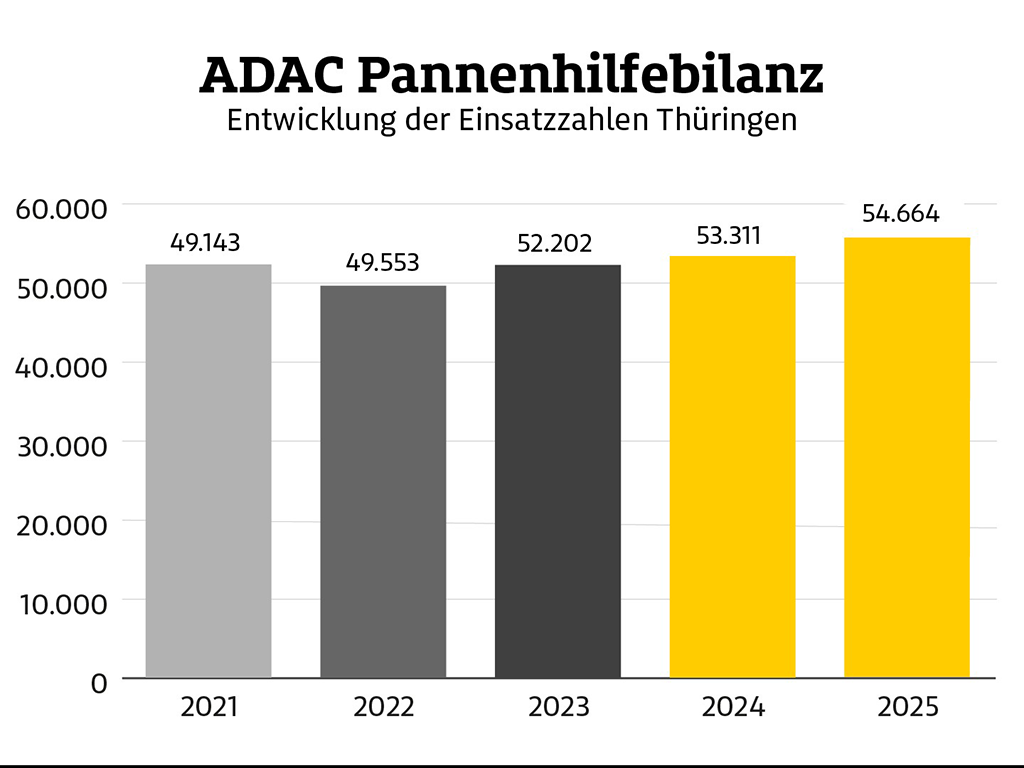 die ADAC Pannenhilfe war 2025 häufiger im Einsatz als im Vorjahr. Auf Thüringens Straßen mussten 54.664 Einsätze (2024: 53.311 Einsätze) organisiert werden. Im Schnitt wurden pro Tag 150 Panneneinsätze gefahren. Im Vergleich zum Vorjahr stieg das Pannenaufkommen damit um 2,5 Prozent. 24.036 Einsätze entfielen dabei auf die 30 in Thüringen ansässigen ADAC Pannenhelfer. Die ADAC Mobilitätspartner waren bei 30.628 Einsätzen gefordert. Bundesweit stiegen die Pannenhilfen auf 3.691.813 (2024: 3.633.154) an. Im Schnitt hilft der ADAC alle neun Sekunden bei einer Panne.