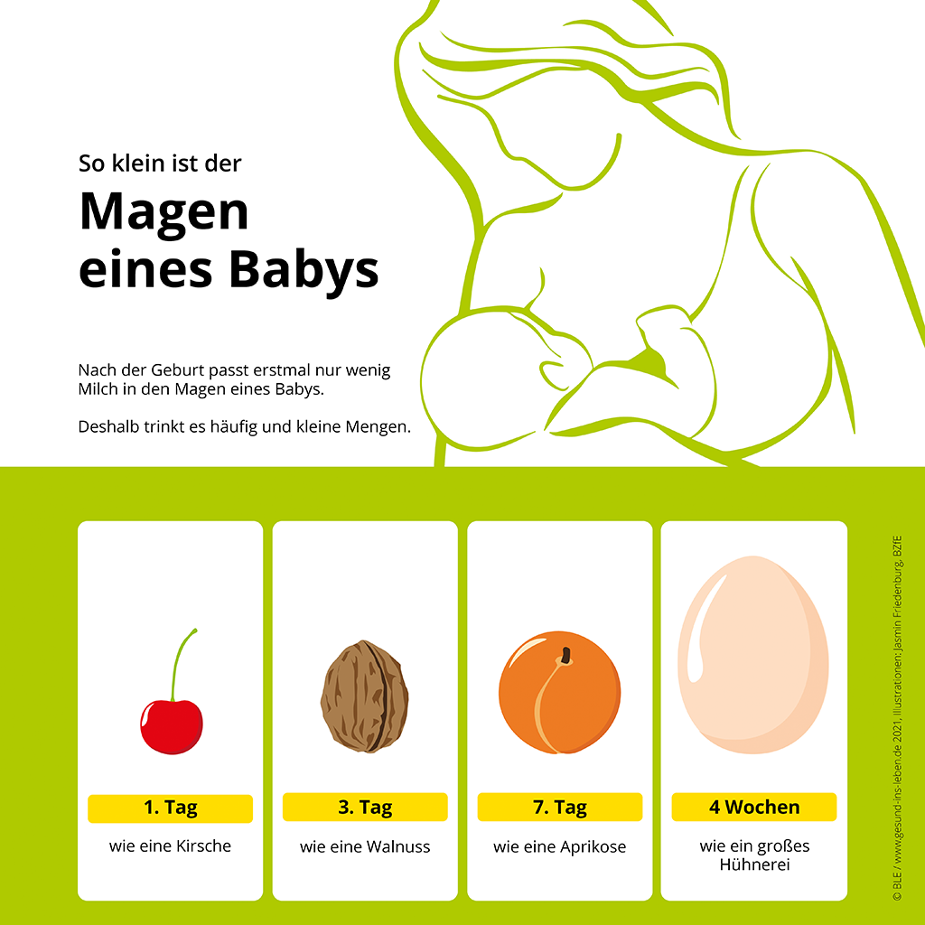 Kolostrum ist perfekt auf die individuellen Bedürfnisse des Babys und seinen Entwicklungsstand angepasst: Der anfangs gerade mal kirschgroße und kaum dehnbare Magen kann nur kleinste Mengen fassen. Aufgrund der hohen Nähr- und Immunstoffkonzentration des Kolostrums reichen in den ersten drei Tagen schon zwei bis zwanzig Milliliter Kolostrum pro Stillmahlzeit aus, um das Baby optimal zu versorgen und zu sättigen. Von einer größeren Menge Milch wäre es anfangs überfordert. Zudem muss es erst lernen, das Atmen, Trinken und Schlucken zu koordinieren.