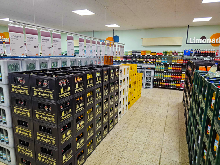 Der neue Getränkemarkt bietet beinahe dreimal so viele Artikel wie zuvor, darunter eine große Auswahl an Wasser, Schorlen und Säften, zahleiche verschiedenen Biersorten, Pils, Weizen und Radler über alkoholfreie Varianten bis hin zu einem umfangreichen Sortiment an Cola-Getränken, Limonaden, Eistees und Energydrinks. Gleichzeitig profitieren auch die Kundinnen und Kunden im Hauptmarkt: Durch die Ergänzung des Getränkemarkts ergibt sich im Hauptmarkt mehr Platz für Lebensmittel und frische Waren.